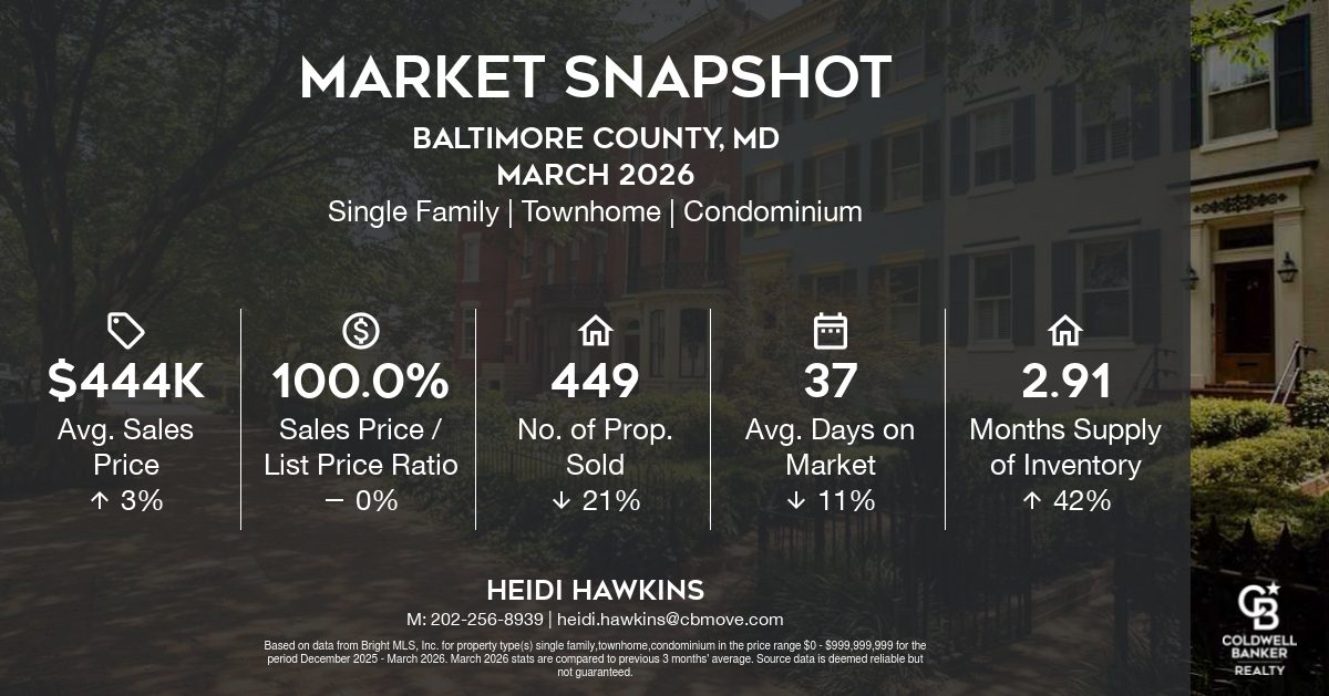 Baltimore County is experiencing moderate price stability with rising inventory. Well‑priced single‑family homes continue to sell reliably, though buyers are moving with more patience and confidence than in recent years. [realtor.com], [corcoranmce.com]